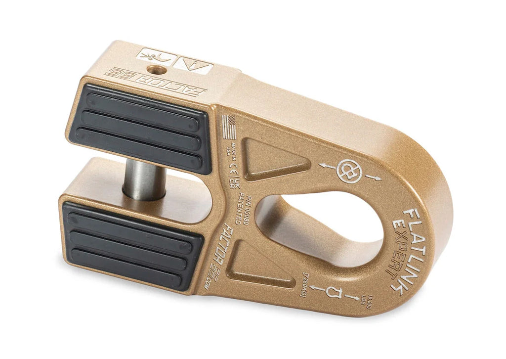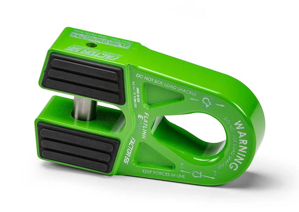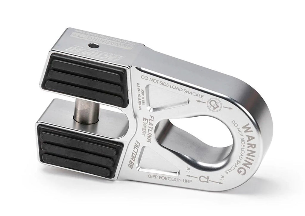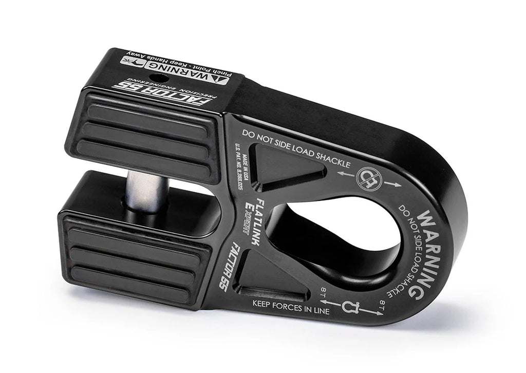 The large pear shaped shackle mounting hole allows for attachment to either the pin or bow end of common screw pin shackles, as well as common OEM recovery points. This makes the new FlatLink E more versatile than the current FlatLink design, but it also adds the possibility of a dangerous shackle side loading condition, especially during momentary slack conditions. A shackle side loading condition is not possible with our standard FlatLink shackle mount due to the shackle pin mounting constraint. For the recreational off roader we highly recommend the safer standard FlatLink product, not the FlatLink E. This way the winch operator does not have to monitor whether the shackle may have shifted and rotated in the recovery tackle.