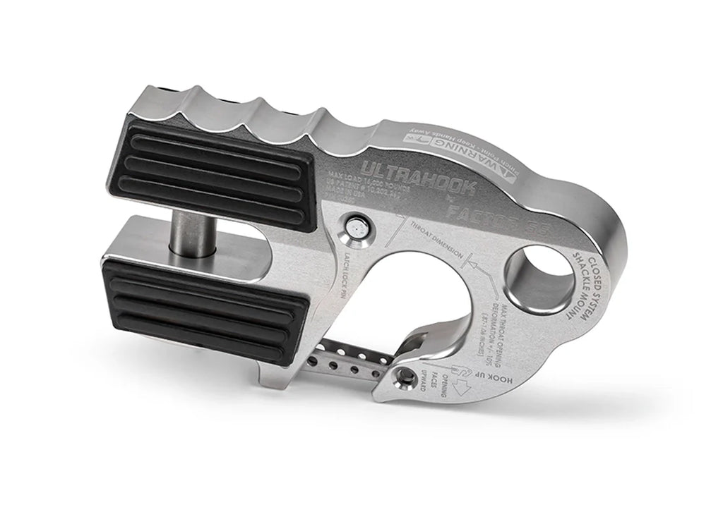 All the benefits of Closed System Winching™️ with the versatility of having a hook. Originally developed to meet the needs of off-road racers who wanted the speed of a hook and functionality of closed system winching, the low-profile UltraHook features an industry-first closed system shackle mount hole machined into the body of the hook and installs in minutes. A latch pin, which is stored in the hook’s body, can lock the safety latch securely into place for a true Closed Loop System™. Integrated finger grips promote proper “Hook Up” orientation. UltraHook is the first winch hook that can be stored neatly against a winch’s fairlead protecting it from a metal-to-metal connection, thanks to EPDM rubber pads, which also eliminate the UltraHook from rattling.